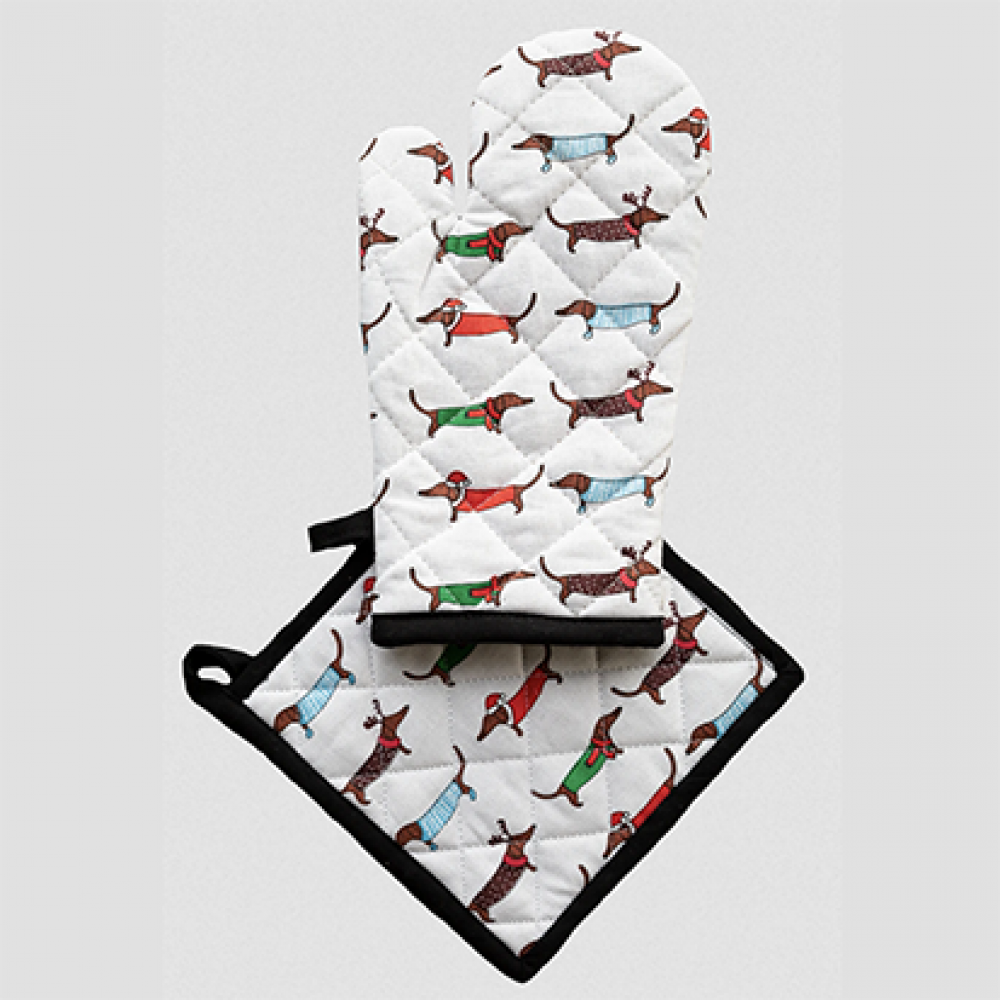 Our Christmas Sausage Dog Oven Glove and Pot Holder set is for the festive host who enjoys celebrating Christmas. Everyone is welcome to enjoy a feast with family and friends. Let your lunches morph into dinners.
