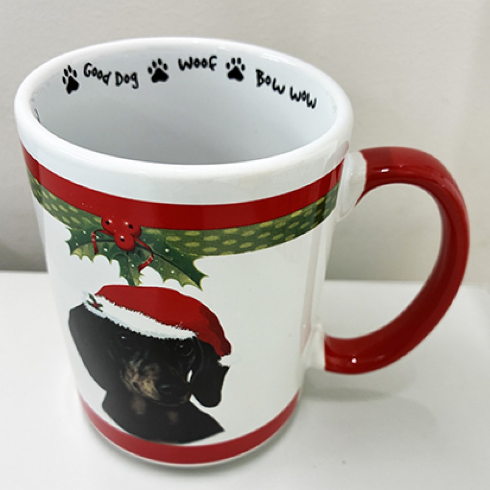 Celebrate the season with this festive ceramic mug featuring an adorable black and tan dachshund in a Santa hat on one side an HO HO HO on the other side.
