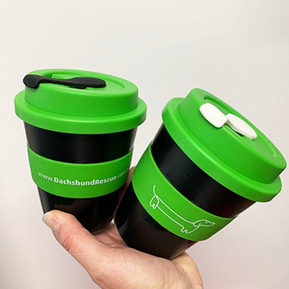 Reusable Travel Mug with solid lid. Comes with soft silicon seal plug in both white and black.