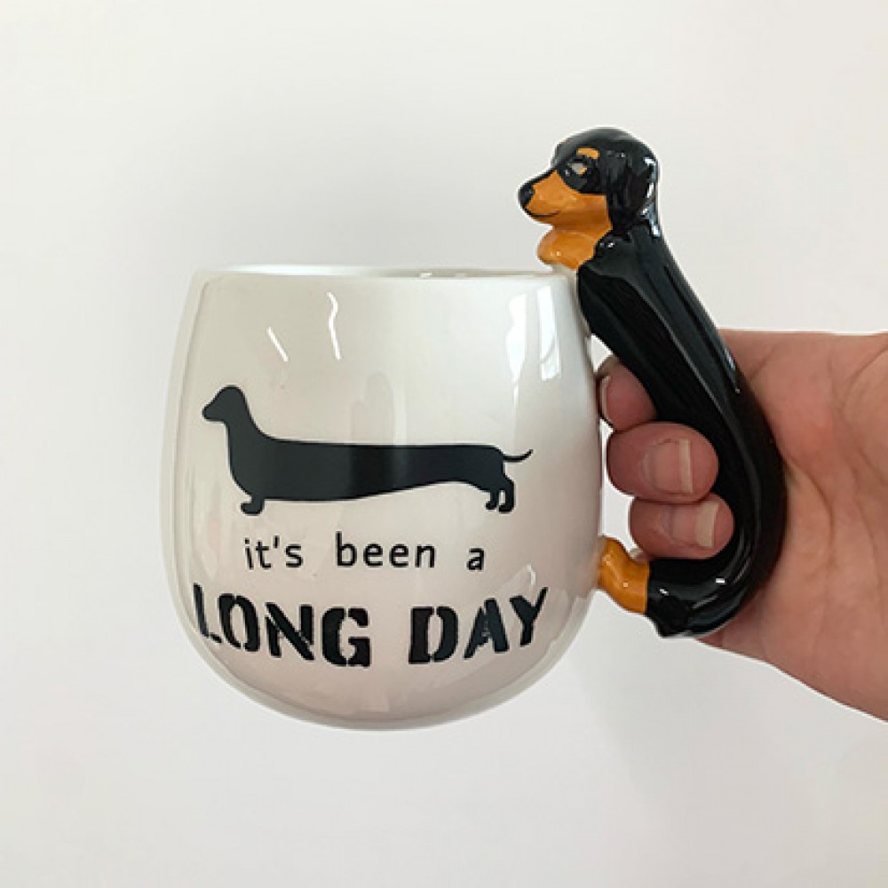 This adorable Dachshund 3D Mug features a black and tan dachshund handle, dachshund silhouette decal and punny quote "It's been a long day" on both sides of the mug. Perfect for hardworking dog lovers! Hand wash only, not dishwasher safe.