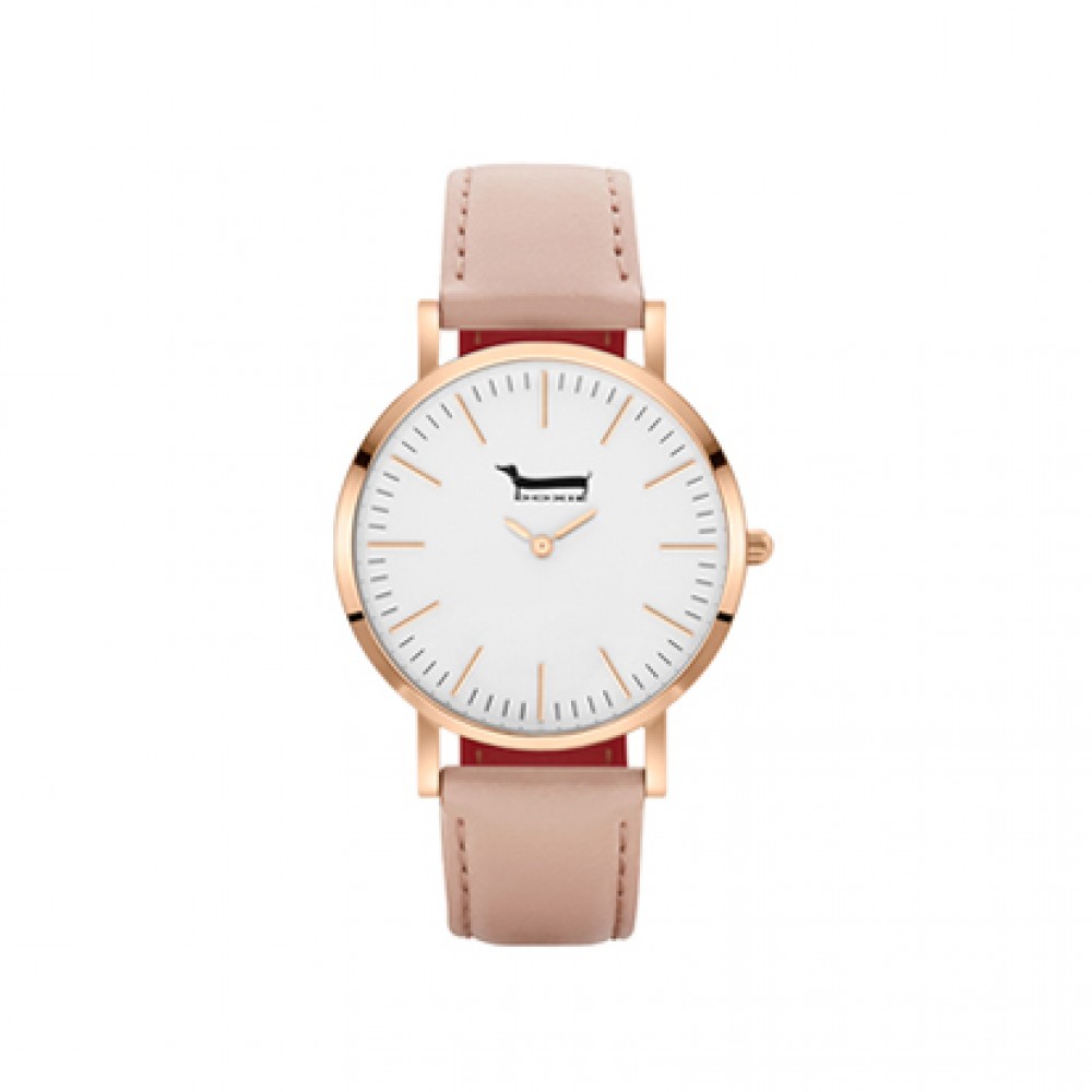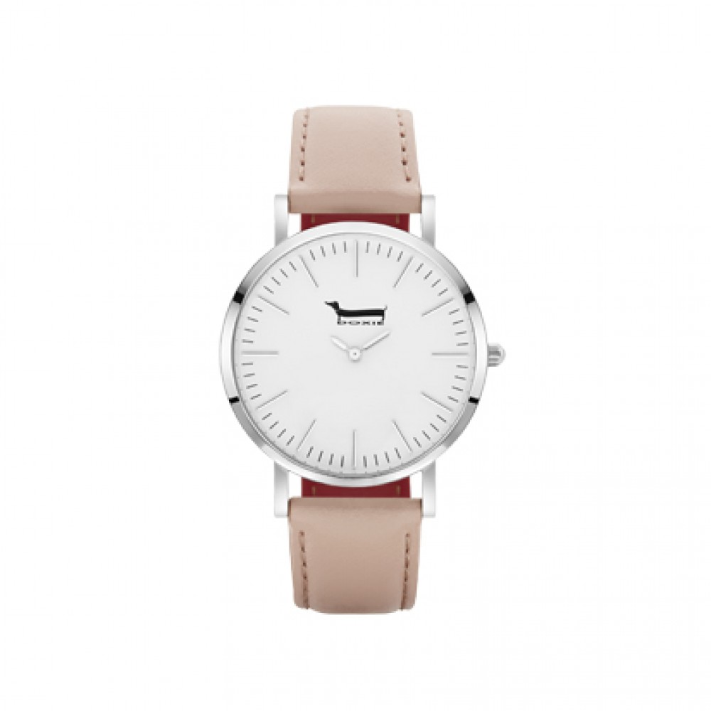 These gorgeous Doxie watches feature a quality nude leather strap with a signature red leather inner and keeper on a rose gold or silver case.