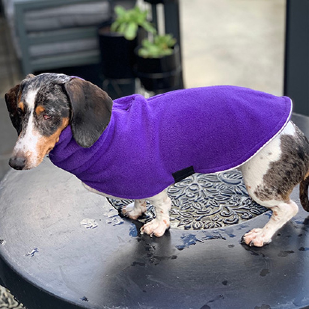 Locally made from premium grade heavy weight anti-pill polar fleece with reflective tape for night time and early morning walks. The snood style long neck and double layer fleece will keep your little one warm. Adjustable velcro can be cut to suit your dachshund. Also includes a buttonhole in the back for your lead.