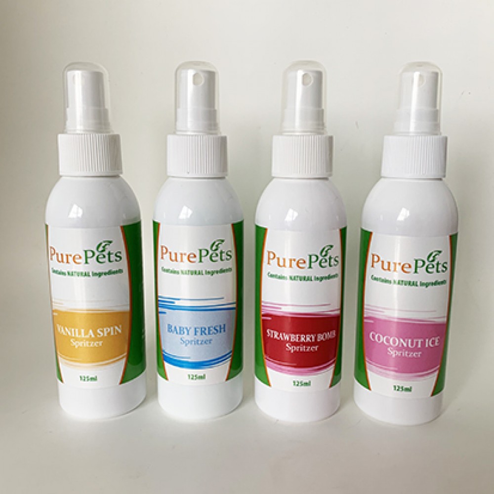 PurePets® Spritzers are alcohol-free colognes to deodorize and refresh the coat while providing a soft, smooth, non-sticky feeling on the skin or coat. Formulated with a unique surfactant blend (derived from plant origins) and other natural ingredients including fresh Aloe Vera Juice, and extracts of sage, rosemary, calendula, marshmallow and lemon.