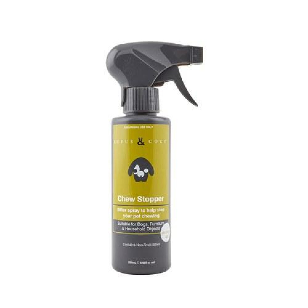Rufus & Coco Chew Stopper is a bitter spray that deters pets from chewing. Rufus & Coco Chew Stopper contains Bitrex (Dentonium Benzoate) which is extremely bitter to train your pet and stop unwanted chewing. Rufus & Coco Chew Stopper is safe to use on pets fur and skin, most furniture, shoes and other household objects. Rufus & Coco Chew Stopper is proudly Australian Made. Rufus & Coco Chew Stopper comes in a 250ml spray bottle.